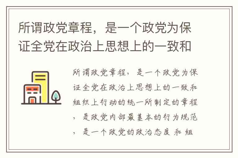 政党章程确实是政党为了确保成员在政治理念、思想和组织上的一致性与统一性而制定的行为规范,具有非常重要的作用。它反映了政党的政治态度和组织结构,是政党组织不可或缺的一部分。