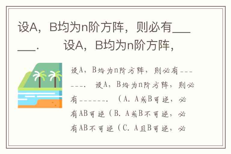 设A,B均为n阶方阵,则必有______. 设A,B均为n阶方阵,则必有______. ( A. A或B可逆,必有AB可逆 ( B. A或B不可逆,必有AB不可逆 ( C. A且B可逆,必有A+B可逆 ( D. A且B不可逆,必有A+B不可逆