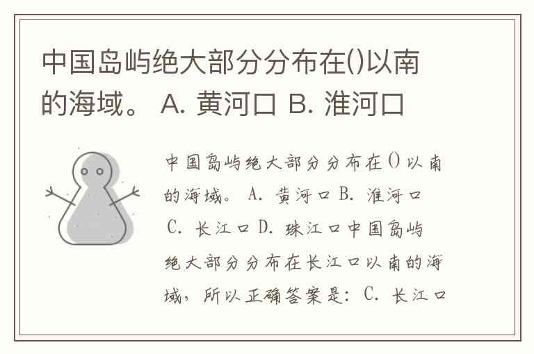 中国岛屿绝大部分分布在()以南的海域。 A. 黄河口 B. 淮河口 C. 长江口 D. 珠江口