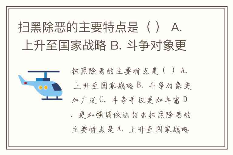 扫黑除恶的主要特点是( ) A. 上升至国家战略 B. 斗争对象更加广泛 C. 斗争手段更加丰富 D. 更加强调依法打击