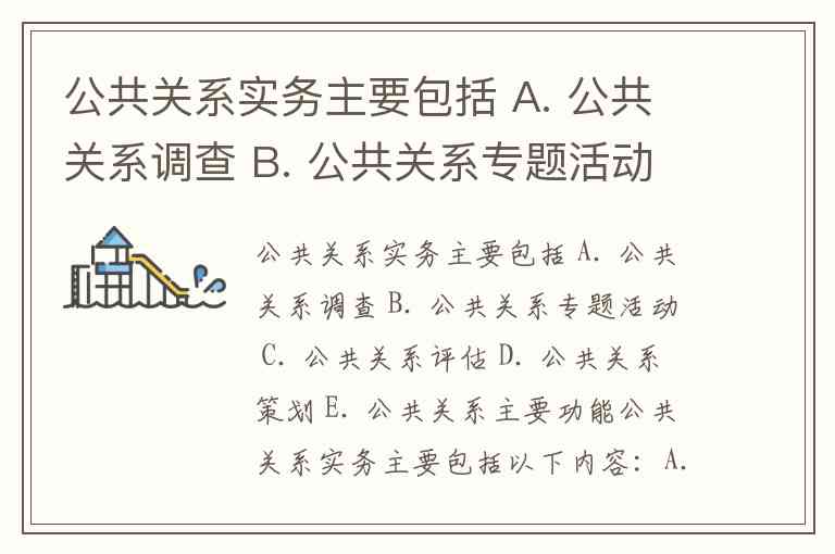 公共关系实务主要包括 A. 公共关系调查 B. 公共关系专题活动 C. 公共关系评估 D. 公共关系策划 E. 公共关系主要功能