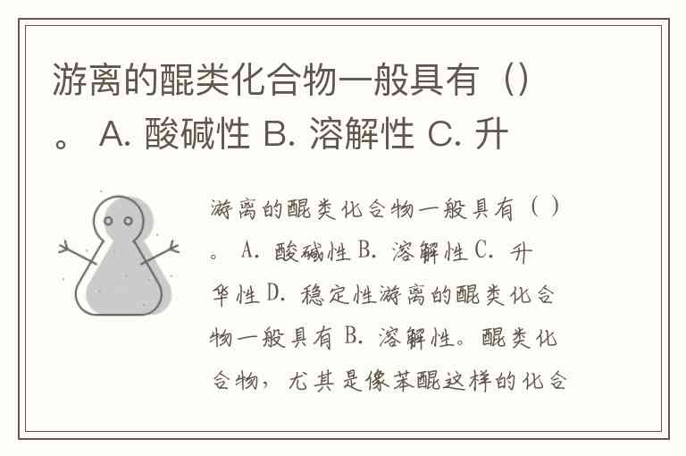 游离的醌类化合物一般具有()。 A. 酸碱性 B. 溶解性 C. 升华性 D. 稳定性