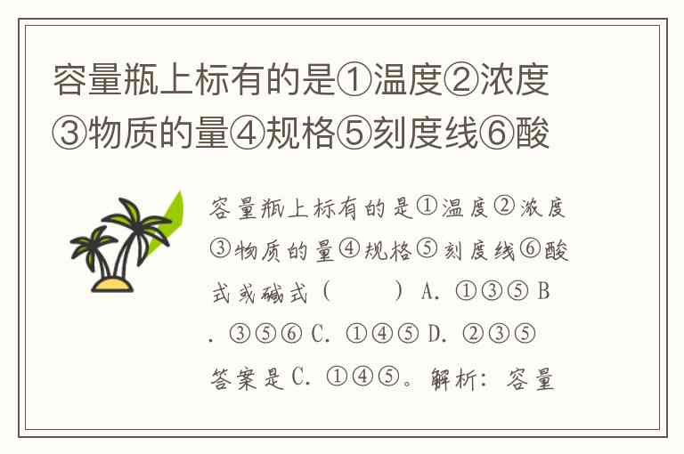 容量瓶上标有的是①温度②浓度③物质的量④规格⑤刻度线⑥酸式或碱式( ) A. ①③⑤ B. ③⑤⑥ C. ①④⑤ D. ②③⑤