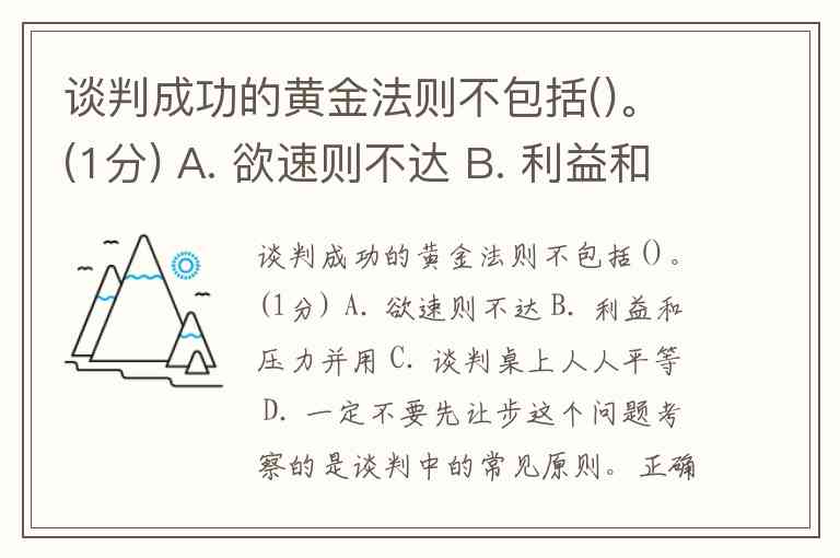 谈判成功的黄金法则不包括()。(1分) A. 欲速则不达 B. 利益和压力并用 C. 谈判桌上人人平等 D. 一定不要先让步