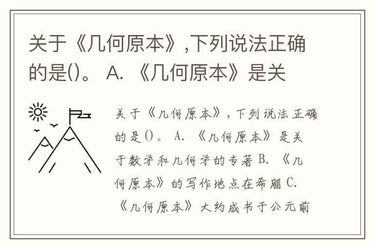 关于《几何原本》,下列说法正确的是()。 A. 《几何原本》是关于数学和几何学的专著 B. 《几何原本》的写作地点在希腊 C. 《几何原本》大约成书于公元前三百年 D. 《几何原本》共有13卷组成