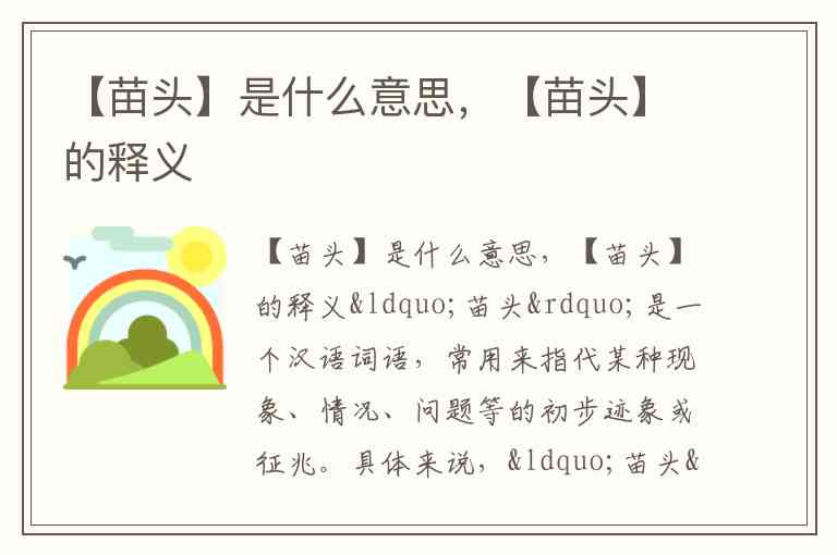总的来说,“苗头”指的是某种事物、现象、变化的初步表现或萌芽阶段,可以用来描述即将发生的事情的预兆。