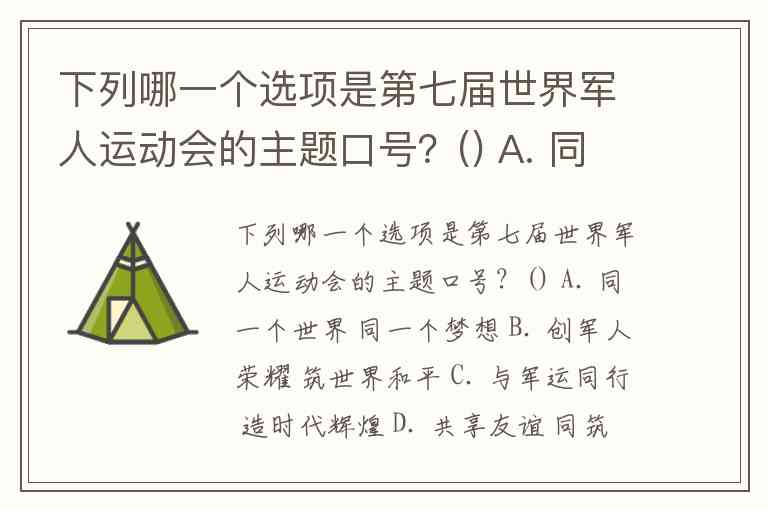 下列哪一个选项是第七届世界军人运动会的主题口号?() A. 同一个世界 同一个梦想 B. 创军人荣耀 筑世界和平 C. 与军运同行 造时代辉煌 D. 共享友谊 同筑和平
