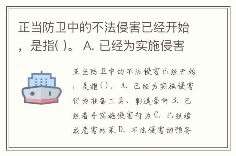 正当防卫中的不法侵害已经开始,是指( )。 A. 已经为实施侵害行为准备工具、制造条件 B. 已经着手实施侵害行为 C. 已经造成危害结果 D. 不法侵害的预备行为已经结束