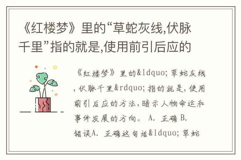 《红楼梦》里的“草蛇灰线,伏脉千里”指的就是,使用前引后应的方法,暗示人物命运和事件发展的方向。 A. 正确 B. 错误