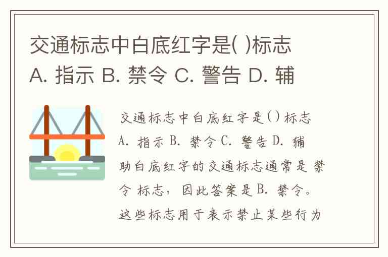 交通标志中白底红字是( )标志 A. 指示 B. 禁令 C. 警告 D. 辅助