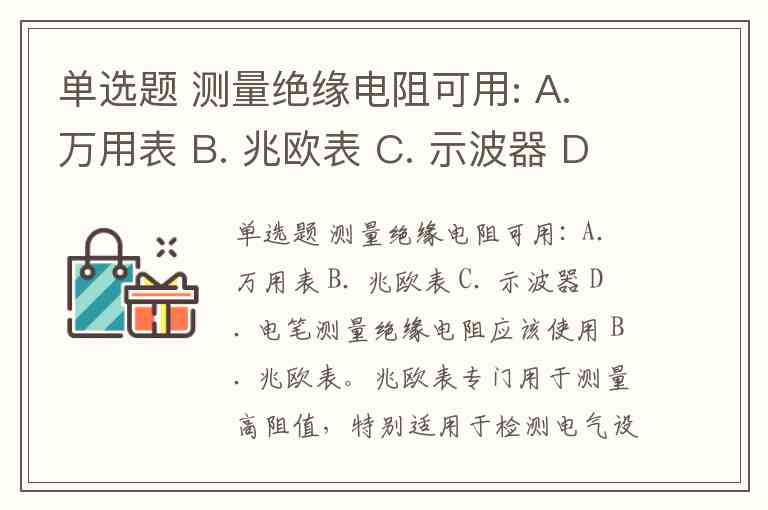 单选题 测量绝缘电阻可用: A. 万用表 B. 兆欧表 C. 示波器 D. 电笔