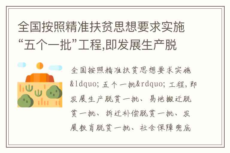 全国按照精准扶贫思想要求实施“五个一批”工程,即发展生产脱贫一批、易地搬迁脱贫一批、拆迁补偿脱贫一批、发展教育脱贫一批、社会保障兜底一批 A. 正确 B. 错误