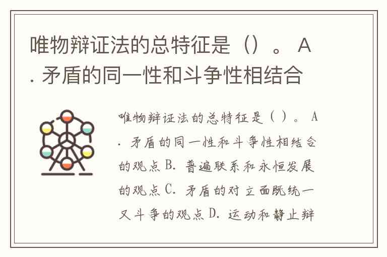 唯物辩证法的总特征是()。 A. 矛盾的同一性和斗争性相结合的观点 B. 普遍联系和永恒发展的观点 C. 矛盾的对立面既统一又斗争的观点 D. 运动和静止辩证统一的观点