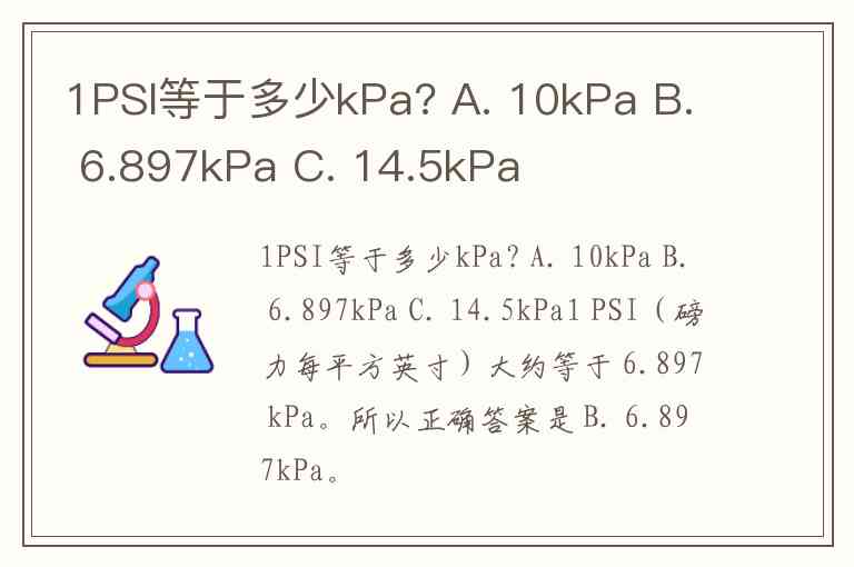 1PSI等于多少kPa? A. 10kPa B. 6.897kPa C. 14.5kPa