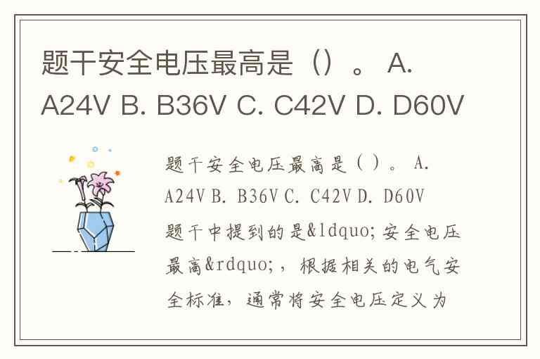 题干安全电压最高是()。 A. A24V B. B36V C. C42V D. D60V