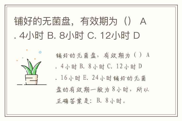 铺好的无菌盘,有效期为() A. 4小时 B. 8小时 C. 12小时 D. 16小时 E. 24小时