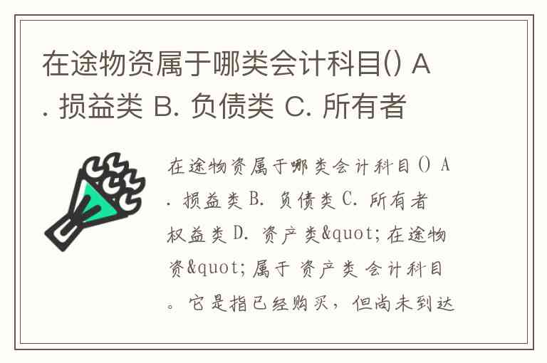在途物资属于哪类会计科目() A. 损益类 B. 负债类 C. 所有者权益类 D. 资产类