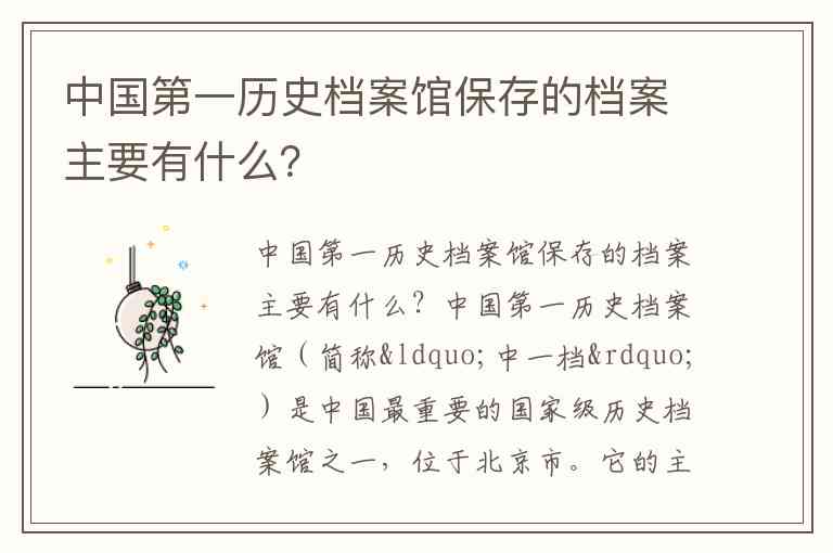 中国第一历史档案馆(简称“中一档”)是中国最重要的国家级历史档案馆之一,位于北京市。它的主要任务是收集、保存和整理中国历史上重要的政府档案,尤其是清朝及民国时期的档案。以下是该档案馆保存的一些主要档案类型: