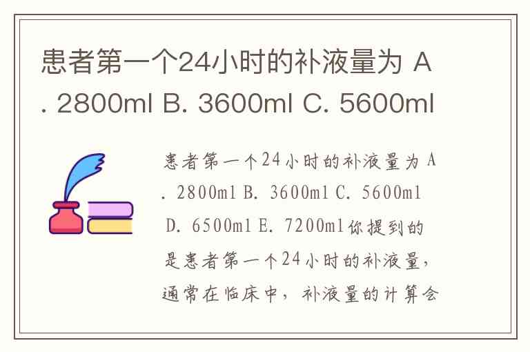 患者第一个24小时的补液量为 A. 2800ml B. 3600ml C. 5600ml D. 6500ml E. 7200ml