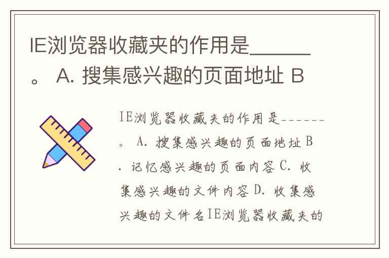 IE浏览器收藏夹的作用是______。 A. 搜集感兴趣的页面地址 B. 记忆感兴趣的页面内容 C. 收集感兴趣的文件内容 D. 收集感兴趣的文件名