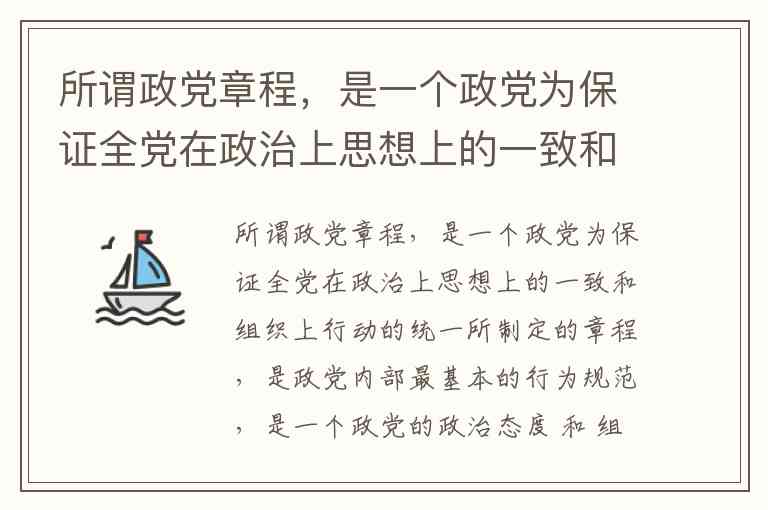 所谓政党章程,是一个政党为保证全党在政治上思想上的一致和组织上行动的统一所制定的章程,是政党内部最基本的行为规范,是一个政党的政治态度 和 组织形态 的集中体现,是完备的政党组织所不可缺少的组成部分。判断对错 A. 正确 B. 错误