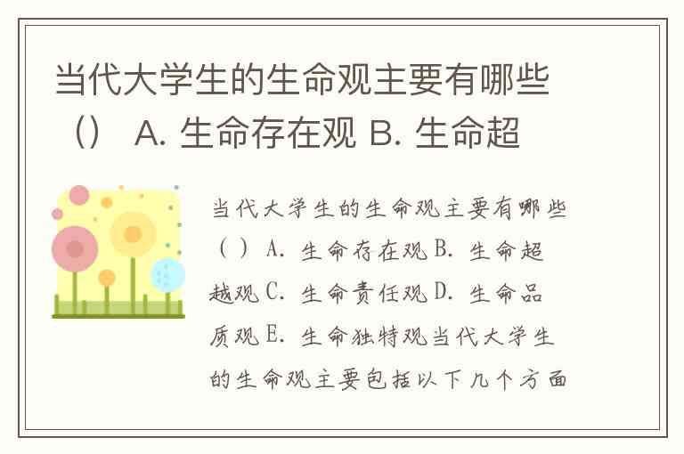 这主要是指大学生对生命质量的追求,包括健康、幸福、成就感等层面的体验。生命品质观注重生活的质量和个人发展的多维度价值,追求充实、有意义的生活。