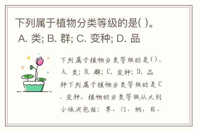 下列属于植物分类等级的是( )。 A. 类; B. 群; C. 变种; D. 品种
