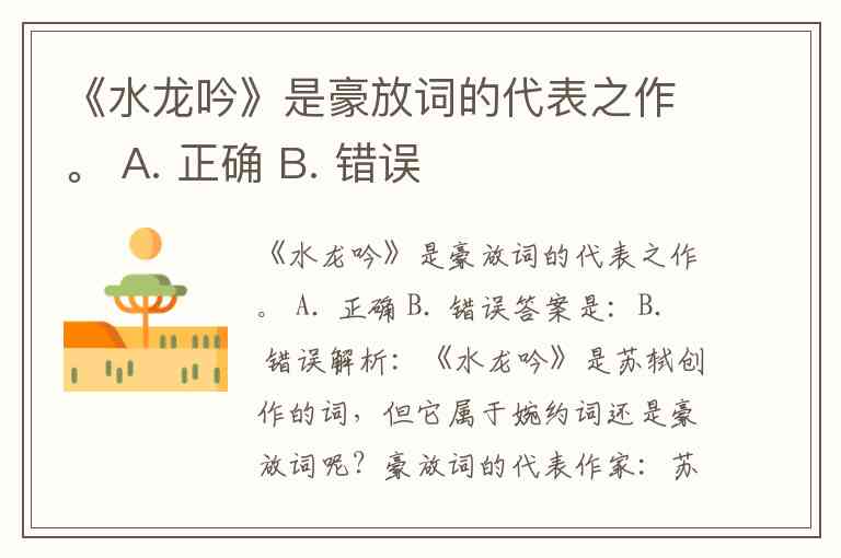 所以如果题目指的是苏轼的《水龙吟》,则不完全准确;如果是辛弃疾的《水龙吟》,则是豪放词的代表作。