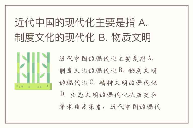 近代中国的现代化主要是指 A. 制度文化的现代化 B. 物质文明的现代化 C. 精神文明的现代化 D. 生态文明的现代化