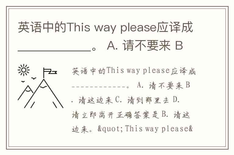 英语中的This way please应译成____________。 A. 请不要来 B. 请这边来 C. 请到那里去 D. 请立即离开