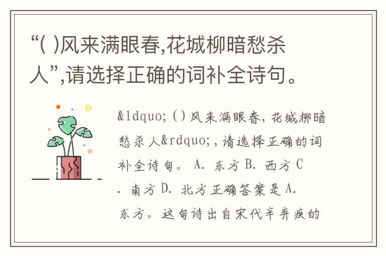 “( )风来满眼春,花城柳暗愁杀人”,请选择正确的词补全诗句。 A. 东方 B. 西方 C. 南方 D. 北方