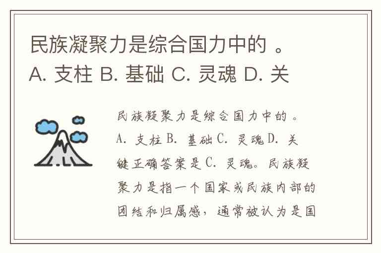 民族凝聚力是综合国力中的 。 A. 支柱 B. 基础 C. 灵魂 D. 关键