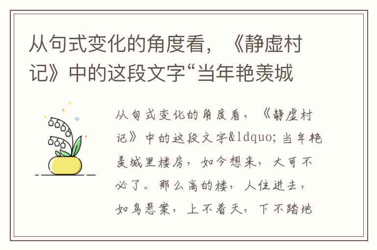 比较明显的是 长短交错,比如“当年艳羡城里楼房,如今想来,大可不必了”是中等长度,“那么高的楼,人住进去,如鸟悬案”后面接短句“上不着天,下不踏地”,再接着长句“可怜掬得一抔黄土……”。
