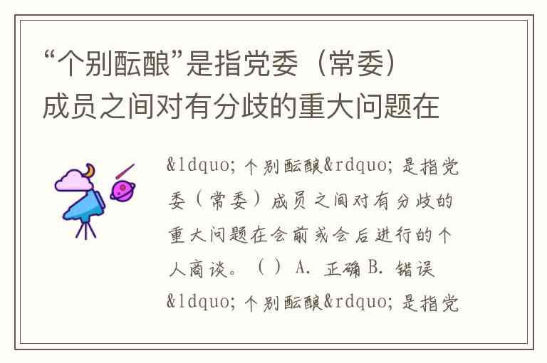 “个别酝酿”是指党委(常委)成员之间对有分歧的重大问题在会前或会后进行的个人商谈。() A. 正确 B. 错误