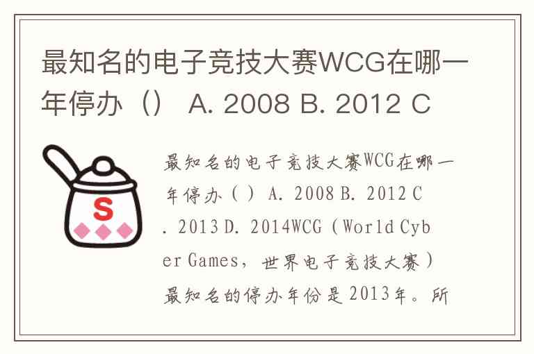 最知名的电子竞技大赛WCG在哪一年停办() A. 2008 B. 2012 C. 2013 D. 2014
