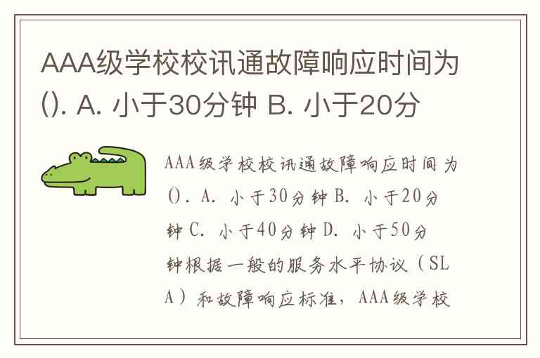 AAA级学校校讯通故障响应时间为(). A. 小于30分钟 B. 小于20分钟 C. 小于40分钟 D. 小于50分钟