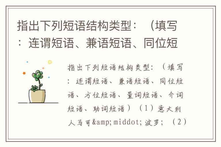 指出下列短语结构类型:(填写:连谓短语、兼语短语、同位短语、方位短语、量词短语、介词短语、助词短语) (1)意大利人马可·波罗;(2)打电话叫车;(3)我答复你之后;(4)嫌这衣服太花:(5)这幅画;(6)来的都是客;(7)用刷子刷碗