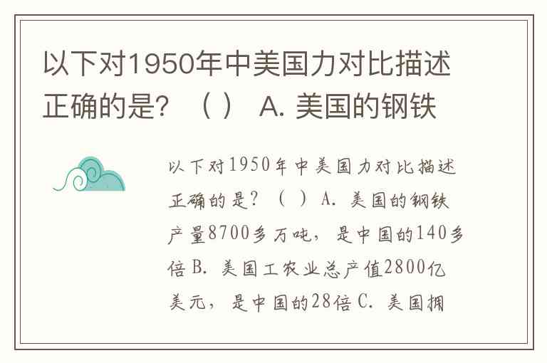 以下对1950年中美国力对比描述正确的是?( ) A. 美国的钢铁产量8700多万吨,是中国的140多倍 B. 美国工农业总产值2800亿美元,是中国的28倍 C. 美国拥有原子弹和世界上最先进的常规武器装备 D. 美国实行的是陆、海、空军立体作战,中国军队以步兵和少量炮兵为主,更无从谈起制空权与制海权