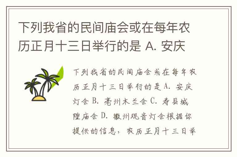 下列我省的民间庙会或在每年农历正月十三日举行的是 A. 安庆灯会 B. 亳州木兰会 C. 寿县城隍庙会 D. 徽州观音灯会