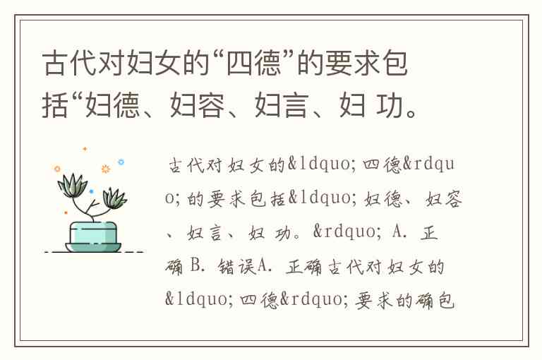 古代对妇女的“四德”要求的确包括“妇德、妇容、妇言、妇功”,这是对女性的道德规范和行为准则的总结。在古代社会,这“四德”代表了一个女性的社会角色和品德标准。
