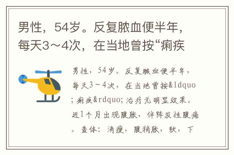 男性,54岁。反复脓血便半年,每天3~4次,在当地曾按“痢疾”治疗无明显效果。近1个月出现腹胀,伴阵发性腹痛。查体:消瘦,腹稍胀,软,下腹轻压痛,右下腹可扪及一肿块,质较硬,尚可活动。首选的辅助检查 A. 纤维结肠镜检查 B. B超 C. 钡餐检查 D. 大便细菌培养 E. CT