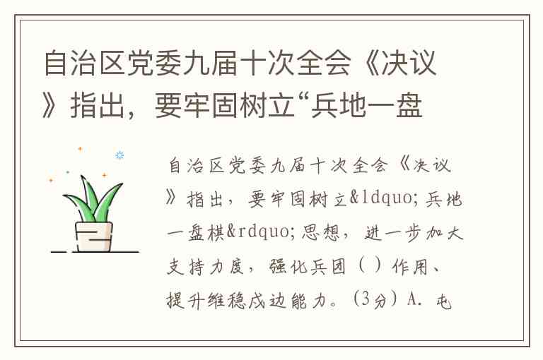 自治区党委九届十次全会《决议》指出,要牢固树立“兵地一盘棋”思想,进一步加大支持力度,强化兵团()作用、提升维稳戍边能力。(3分) A. 屯垦 B. 改革 C. 维稳 D. 经济建设