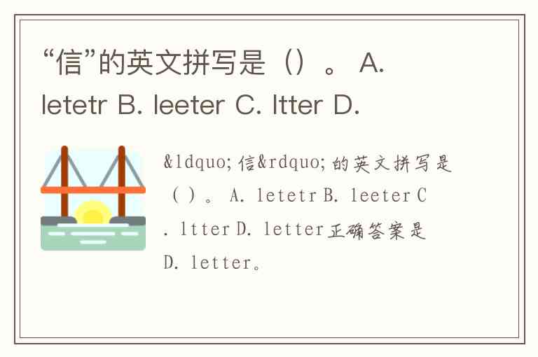 “信”的英文拼写是()。 A. letetr B. leeter C. ltter D. letter