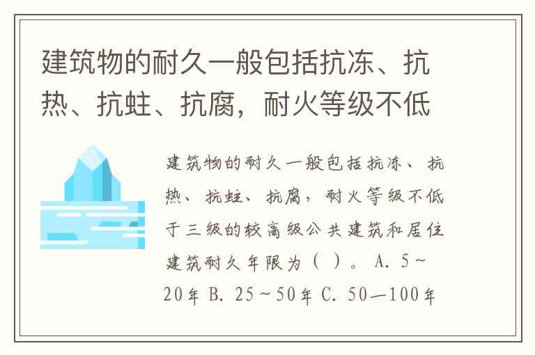 建筑物的耐久一般包括抗冻、抗热、抗蛀、抗腐,耐火等级不低于三级的较高级公共建筑和居住建筑耐久年限为( )。 A. 5~20年 B. 25~50年 C. 50一100年 D. 100年以上