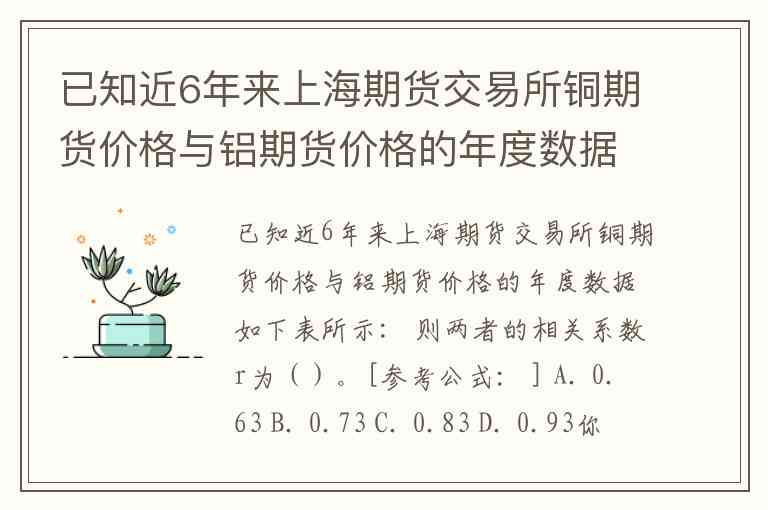 已知近6年来上海期货交易所铜期货价格与铝期货价格的年度数据如下表所示: 则两者的相关系数r为()。[参考公式: ] A. 0.63 B. 0.73 C. 0.83 D. 0.93