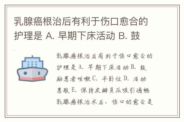 乳腺癌根治后有利于伤口愈合的护理是 A. 早期下床活动 B. 鼓励患者咳嗽 C. 半卧位 D. 活动患肢 E. 保持皮瓣负压吸引通畅