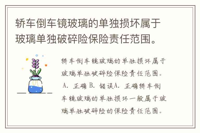 轿车倒车镜玻璃的单独损坏属于玻璃单独破碎险保险责任范围。 A. 正确 B. 错误