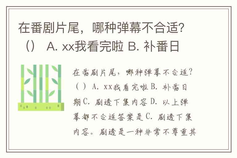 在番剧片尾,哪种弹幕不合适?() A. xx我看完啦 B. 补番日期 C. 剧透下集内容 D. 以上弹幕都不合适