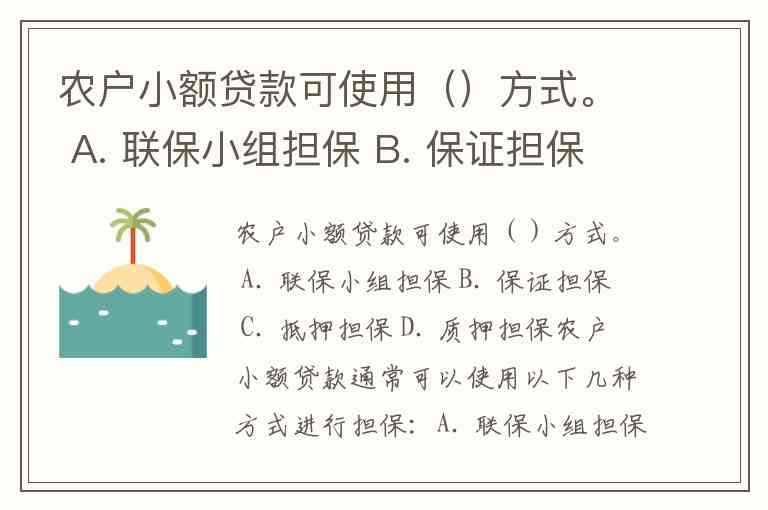 农户小额贷款可使用()方式。 A. 联保小组担保 B. 保证担保 C. 抵押担保 D. 质押担保