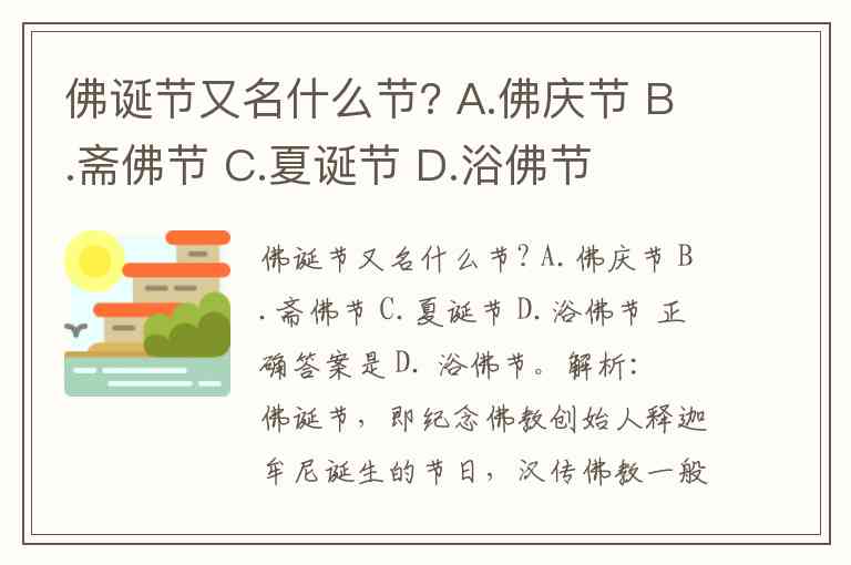 解析:佛诞节,即纪念佛教创始人释迦牟尼诞生的节日,汉传佛教一般定为农历四月初八。在这一天,佛教寺院会举行“浴佛”仪式,即用香汤沐浴太子像(释迦牟尼诞生像),因此佛诞节又被称为 浴佛节。其他选项(A佛庆节、B斋佛节、C夏诞节)并非佛诞节的通用别名。